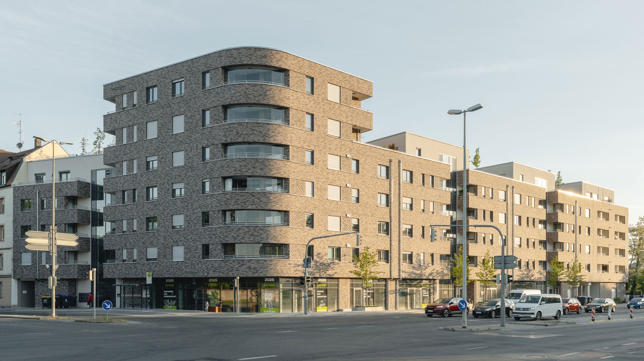 Studentenappartements und Gewerbenutzung im Erdgeschoss. Eine drei bis fünfgeschossige, U-förmige Blockrandbebauung mit Lärmschutzgrundrissen und ein siebengeschossiger Hochpunkt am Kreuzungspunkt erzeugen eine urbane Nutzungsdichte.