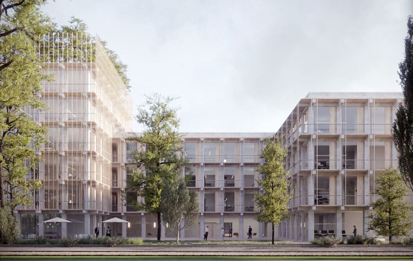 sowie durch die Errichtung der Neubauten in Holzhybridbauweise und Einsatz eines regenerativen Energiekonzepts. Des Weiteren wird der Blockrand weit zurückgesetzt und durch einen neuen Hochpunkt akzentuiert.